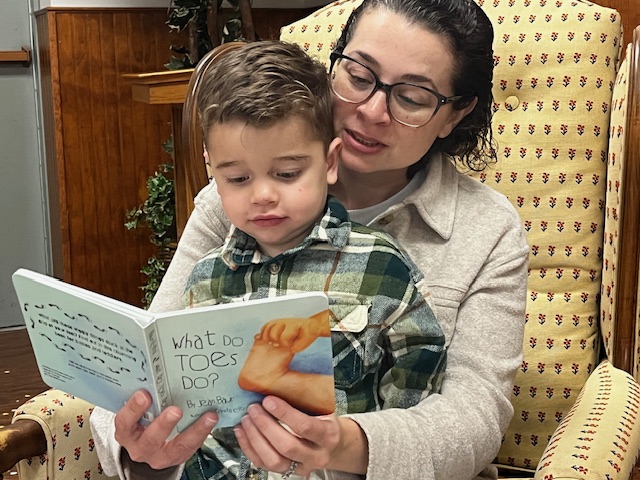 It may seem like a small thing, but being read to is powerful. It’s a bond between the reader and the child, and a journey into the world of the book. Even a simple board book like my “What Do Toes Do?” is an invitation to relax, enjoy, be together. As I like to say, this little book is making a big difference. It’s being given to mothers at a workshop on parenting and literacy, and today, I’m dropping off 30 copies for Alliance for Family Support. They do amazing work–here’s a quote from their website: